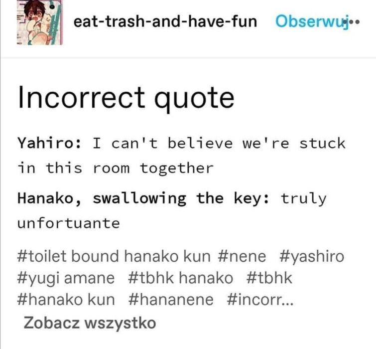 Hanako Kun Incorrect Quotes On Tumblr from 64.media.tumblr.com They were all rumours, or so you thought, until one day you accidentally run into the 'secret wonder' of the school, dragging you into the true madness of the academy. Akane, thinking that nene was doing that at will, yelled and dragged her body to the roof, threatening to kill. Welcome to the dark side, we have memes. Her hair is let down, with even bangs and two long. Tbhk kou tbhk hanako toilet bound hanako kun tbhk nene nene yashiro kou minamoto hanako kun amane yugi incorrect jibaku shounen hanako kun quotes jshk jibaku shounen hanako kun incorrect toilet bound hanako kun quotes incorrect quote incorrect quotes. When you die, that's it. Sorry for being mean and gay. You recently joined kamome academy and have heard of the schools '7 wonders'.